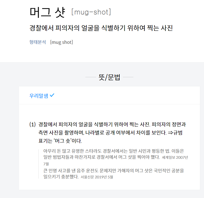 국어사전에는 경찰조사 과정에서 피의자를 얼굴을 식별하기 위해 찍는 사진이라는 뜻도 있습니다. 머그샷이라는 것은 은어로서 체포된 범일을 촬영한 사진을 의미하며 Police Photograph이 정식명칭입니다.