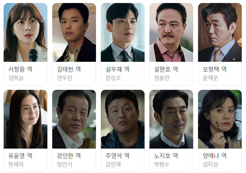 설판호 역은 배우 정웅인이 맡았으며 무진그룹의 회장이자, 설우재의 아버지입니다. 모형택 역은 배우 윤제문이 맡았으며 전직 검사 출신의 정치인입니다.