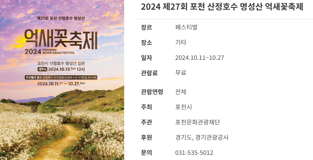 2024년 기준으로 명성산과 산정호수 일대에서 10월 11일부터 27일까지 17일간 '제27회 포천 산정호수 명성산 억새꽃 축제'가 개최됩니다.
