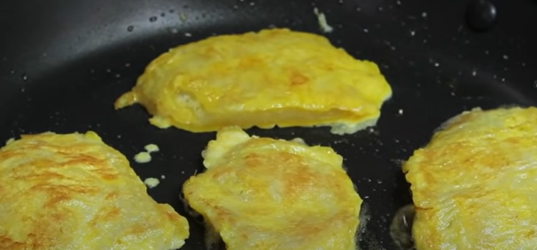 그 다음, 소금과 후추로 밑간을 합니다. 밑간한 고기에 밀가루를 얇게 묻힌 후, 달걀물을 골고루 입혀줍니다. 마지막으로, 기름을 두른 팬에 중약불로 핏기가 가실 정도로만 살짝 익혀내면 완성입니다.