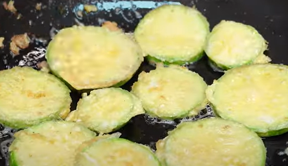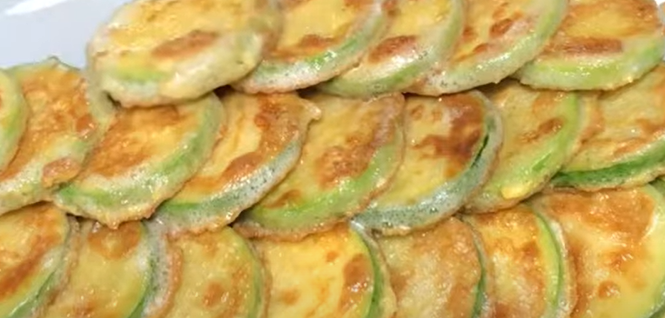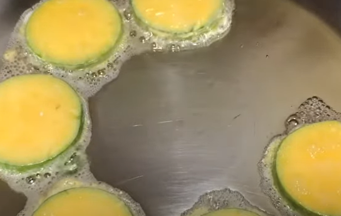 밑간한 애호박에 밀가루를 얇게 묻힌 후, 달걀물을 골고루 입혀줍니다. 마지막으로, 기름을 두른 팬에 중약불로 앞뒤로 노릇하게 지져내면 완성입니다.