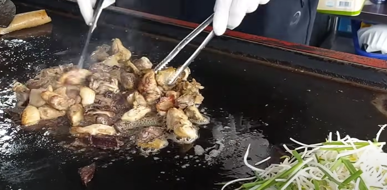 큰 철판에 콩팥, 지라, 유통, 돼지껍질, 도래창, 돼지꼬리 등 다양한 부위를 한꺼번에 볶아 여럿이 둘러앉아 나눠 먹는 독특한 분위기가 특징입니다.