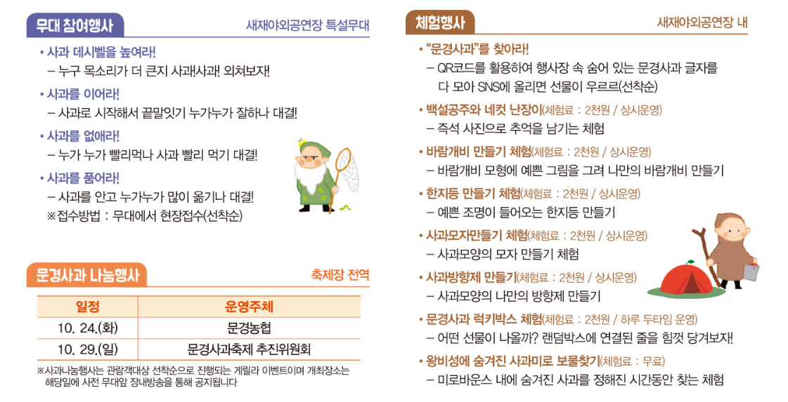 이번 축제는 문경사과 판매장을 운영하기 때문에 사과를 맛보고 구매하기에 좋습니다. 문경사과 전시 홍보관을 운영하고 있습니다.