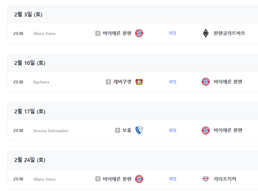 2월 3일 토요일에는 묀헨글라트바흐와 경기를 시작으로 10일 토요일에는 레버쿠전 17일 토요일 보훔, 24일 토요일에는 라이프치히와 경기가 펼쳐지게 됩니다.