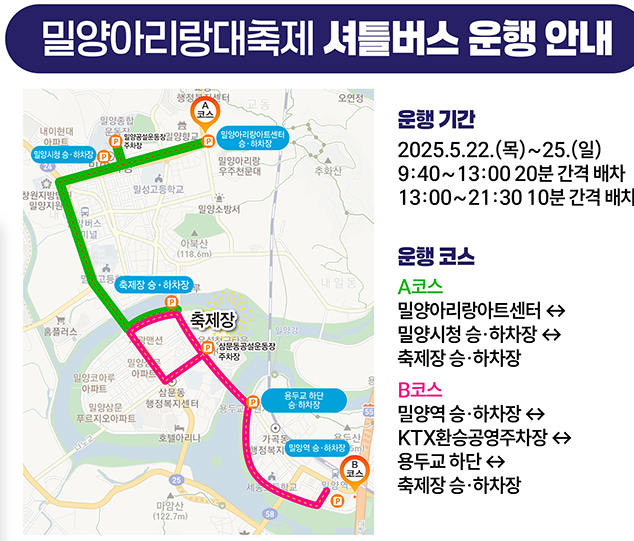 이에 따라 주차장과 축제장 사이를 오가는 셔틀버스가 5월 22일부터 25일까지 오전 9시 40분부터 밤 9시 30분까지 20분 간격으로 운행됩니다. 셔틀버스는 밀양아리랑아트센터, 시청, 밀양역, 야외수영장 등 다양한 승하차장에서 이용할 수 있어 편리하게 축제장을 오갈 수 있습니다.