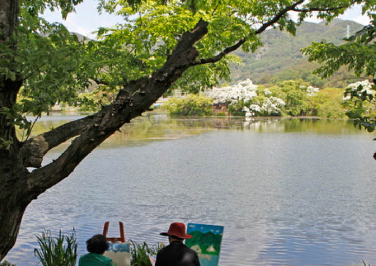 5월이면 푸른 물 위로 새하얀 이팝나무 꽃이 만개하여 마치 설경을 연상시키는 아름다운 풍경이 펼쳐집니다.