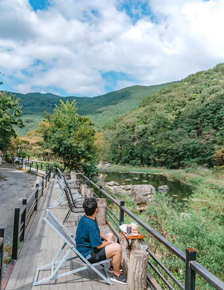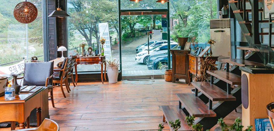 선선한 바람과 함께 단장천의 물소리를 들으며 커피를 즐길 수 있어 힐링하기에 제격입니다. 카페 내부는 빈티지한 소품들로 가득 채워져 있어 감성적인 분위기를 자아냅니다.