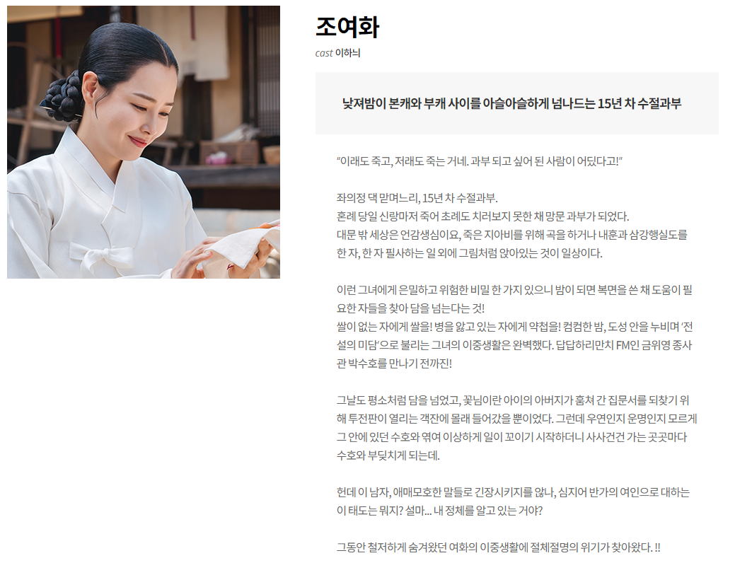 밤에 피는 꽃 드라마의 핵심적인 주요 인물은 크게 4명이라고볼수 있습니다. 조여화 역은 배우 이하늬님이 맡았습니다. 광기의 과부이자 무술의 신의 캐릭터입니다.