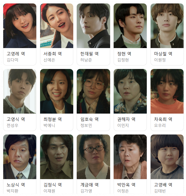 주요 등장인물로는 가족을 위해 열심히 사는 고영례 역에 김다미, 당차고 자유로운 신입 안내양 서종희 역에 신예은, 그리고 부유한 집안 출신의 복서 한재필 역에 허남준이 출연하며, 오승백 배우가 연기하는 장덕구는 재필과 같은 고등학교 복싱 라이벌 역할을 맡았습니다.