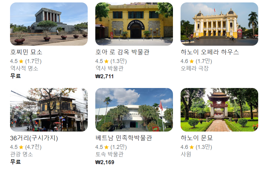 호아 로 감옥 박물관에 방문하시거나 특히 가을 시즌에 가면 상당히 좋으며 낭만적인 호수 분위기를 느끼기에 좋습니다. 이외에 하노이에는 하노이 성요셉 성당, 오페라 하우스, 군 역사 박물등 다양한 볼거리가 있습니다.