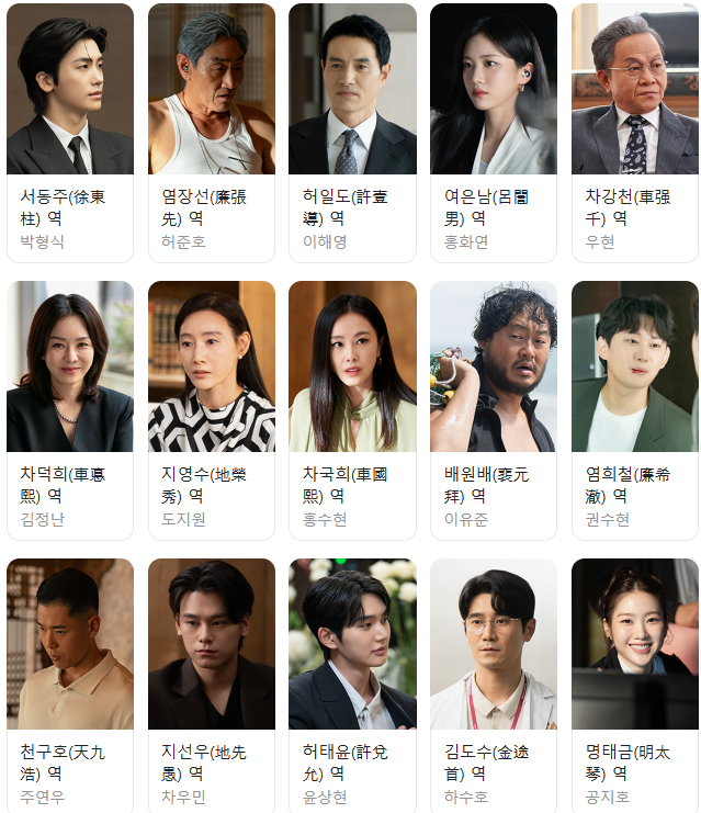 염장선 (허준호): 법학 대학원 석좌 교수이자 킹메이커를 배후에서 조종하는 실세. 희철의 양아버지이자 은남의 시아버지입니다. 냉철하고 카리스마 넘치는 인물로, 2조 원을 되찾기 위해 수단과 방법을 가리지 않습니다.
