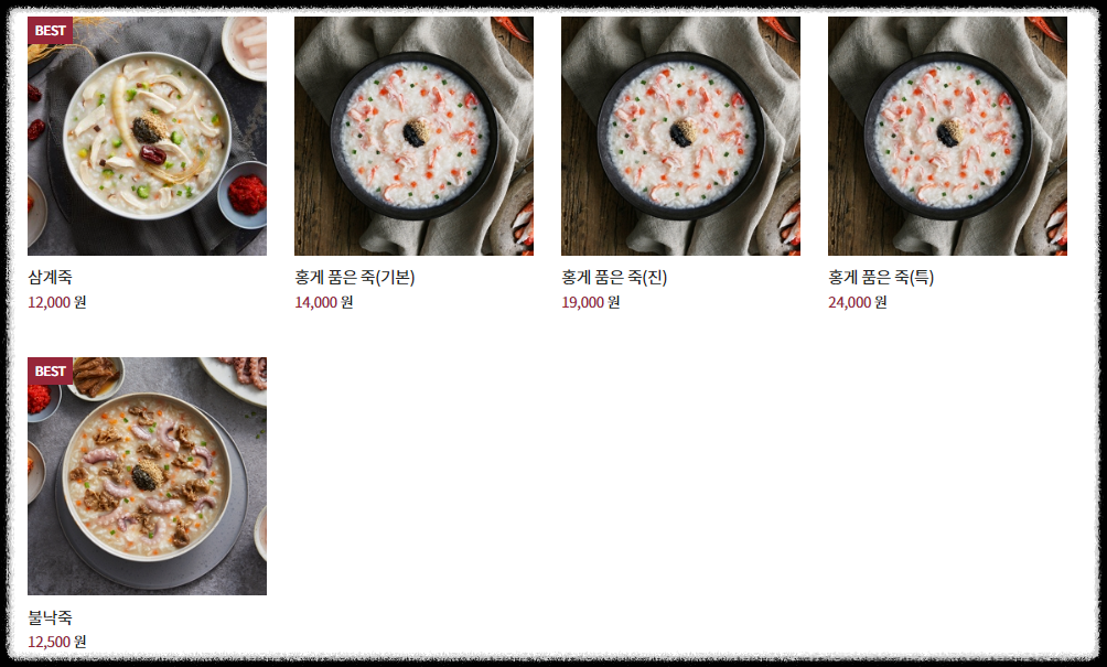 가평잣죽: 고소한 가평 잣을 듬뿍 넣어 만든 영양 만점 고급 죽 (13,000원) 흑임자죽: 검은깨의 고소함과 풍부한 영양을 담은 건강 죽 (9,000원)
