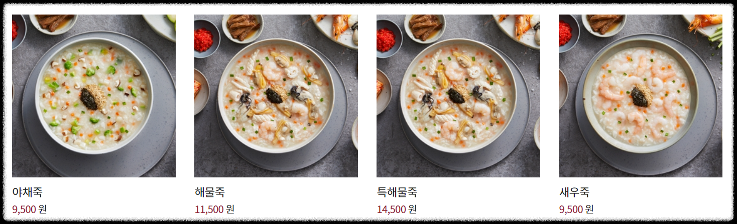 야채죽: 신선한 야채의 맛과 향을 그대로 느낄 수 있는 깔끔하고 담백한 죽 (9,500원) 참치야채죽: 고소한 참치와 신선한 야채가 어우러져 맛과 영양을 더한 죽 (10,000원) 가장 기본적인 맛, 흰죽 시리즈입니다.