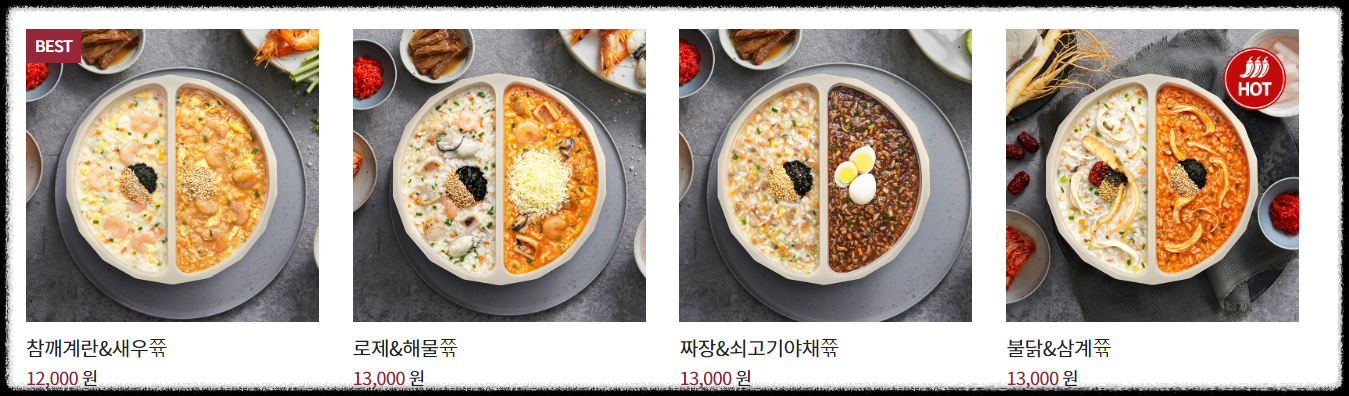 가평잣죽: 고소한 가평 잣을 듬뿍 넣어 만든 영양 만점 고급 죽 (13,000원) 흑임자죽: 검은깨의 고소함과 풍부한 영양을 담은 건강 죽 (9,000원)