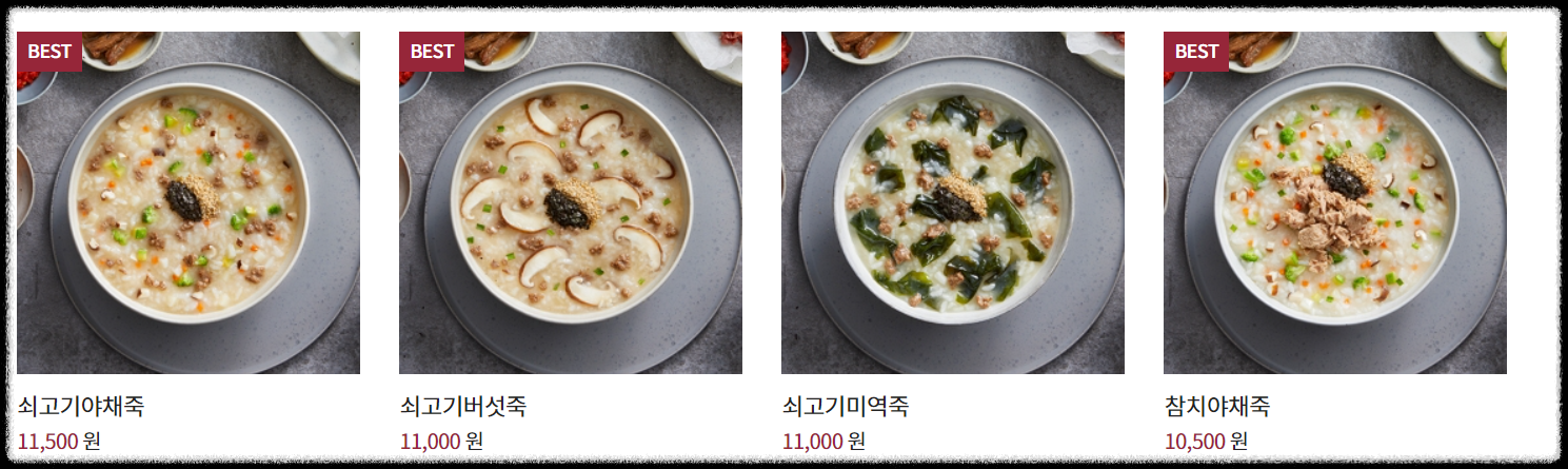 쇠고기야채죽: 신선한 야채와 쇠고기의 조화로운 맛이 일품인 영양 만점 죽 (11,500원) 쇠고기버섯죽: 향긋한 버섯과 쇠고기의 풍미가 어우러져 깊은 맛을 선사하는 죽 (11,000원)
