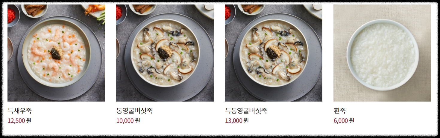 통영굴버섯죽: 싱싱한 통영 굴과 향긋한 버섯의 조화가 매력적인 죽 (10,000원) 특영굴버섯죽: 굴과 버섯을 더욱 푸짐하게 넣어 깊은 맛을 더한 죽 (13,000원) 깔끔하고 담백한 맛, 야채죽 및 참치야채죽입니다.