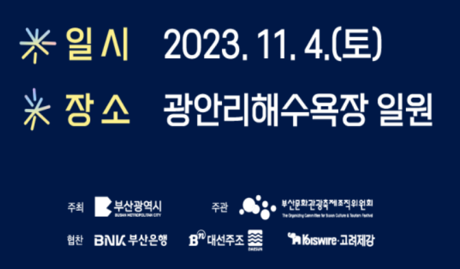 올해의 경우 광안리해수욕장 이기대 동백섬 일원이 그 장소이며 2023년 11월 4일 토요일 저녁 20:00시부터 시작됩니다.