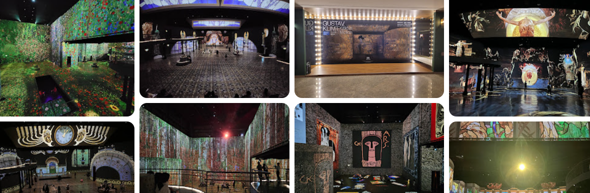 전시는 크게 세 가지 공간으로 구성되어 있습니다. 메인 전시 공간에서는 클림트, 고흐 등 유명 화가들의 작품을 감상할 수 있으며, 두 번째 공간에서는 현대 미디어 아티스트들의 작품을 만나볼 수 있습니다.