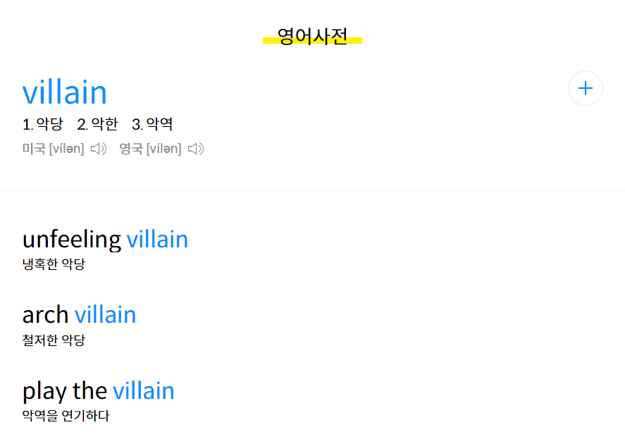 빌런은 영어 단어입니다. Villain이라는 단어가 있습니다. 어학사전에서 이 단어를 검색해 보면 악당, 악한, 악역이라는 뜻으로 나오고 있습니다.