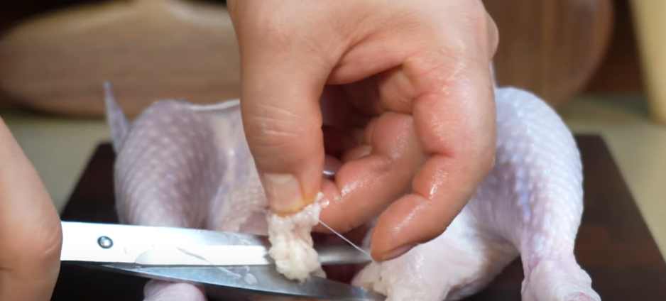 불린 찹쌀과 녹두, 마늘 몇 알, 대추 한두 개, 인삼 한 뿌리 등을 세척한 닭 속에 차곡차곡 넣어줍니다. 지나치게 많이 넣으면 닭이 터질 수 있으므로 2/3 정도만 채우는 것이 안전합니다. 마지막으로 닭 다리를 실로 단단히 묶어 속재료가 빠져나오지 않게 고정합니다.