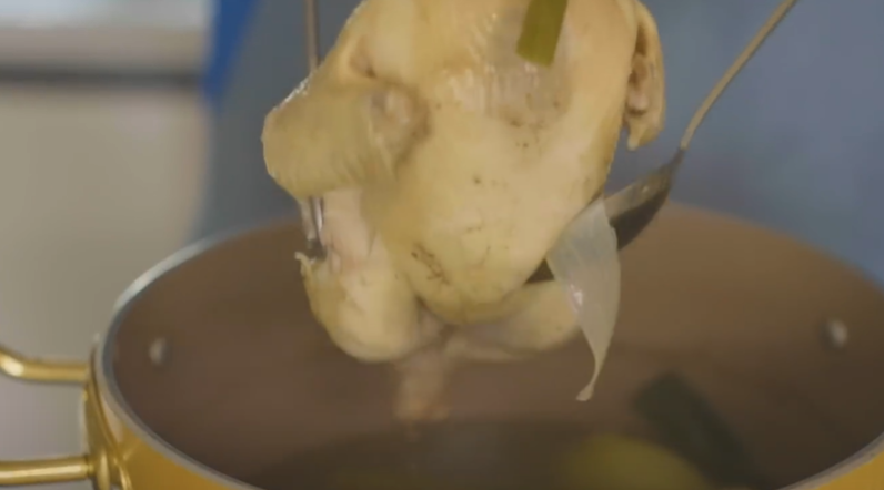 닭이 완전히 익으면 닭과 한약재를 건져냅니다. 닭은 따로 접시에 담아 식히고, 한약재는 향 주머니를 사용했다면 제거합니다. 면보나 체에 육수를 걸러 맑고 깨끗한 육수만 사용합니다.