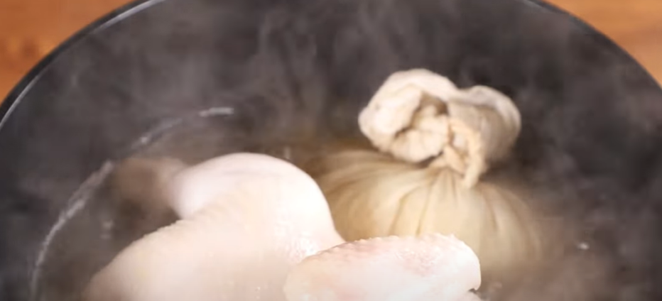 닭의 크기에 따라 물의 양을 조절하며, 보통 닭의 2~3배 정도의 물을 사용하는 것이 적당하며, 냄비를 센 불에 올리고 물이 끓어오르면 뚜껑을 열고 손질된 닭을 넣습니다.