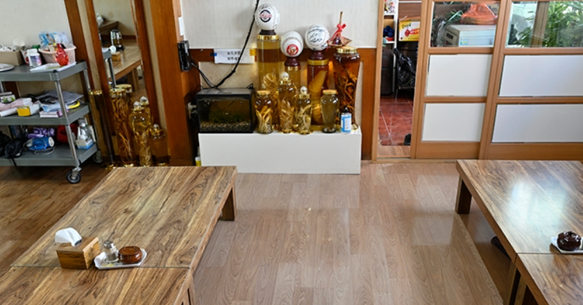 내부에는 입식 테이블과 좌식 테이블이 모두 마련되어 있어 편안하게 식사를 즐길 수 있습니다. 특히, 식당 한쪽 벽면을 가득 채운 담금주는 보는 즐거움을 더해줍니다.