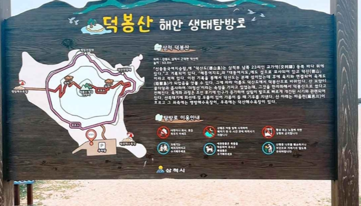 덕봉산은 해안가에 위치한 소규모 산으로, 자연 생태와 아름다운 해안 경관을 동시에 즐길 수 있는 탐방로가 조성되어 있습니다.