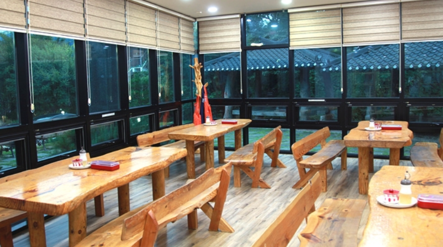 식당 내부는 신발을 벗고 들어가는 구조로, 좌식 테이블과 입식 테이블이 모두 마련되어 있어 편하게 식사를 즐길 수 있습니다. 특히 창가 자리에서는 넓은 마당을 바라보며 식사할 수 있어 더욱 특별한 분위기를 느낄 수 있습니다.