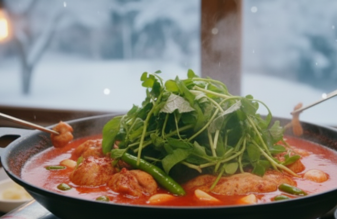 신선한 닭고기와 쑥갓 그리고 미나리와 냉이가 듬뿍 들어가 국물에서 깊은 채수의 향이 느껴집니다. 먼저 채소와 떡 사리를 건져 먹은 후 남은 국물에 라면이나 우동을 넣어 즐기고 마지막으로 고소한 김가루를 넣은 볶음밥까지 코스로 즐겨야 진정한 물닭갈비의 맛을 보았다고 할 수 있습니다.