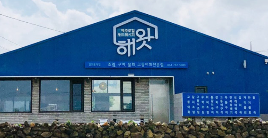 푸른 바다를 떠올리게 하는 시원한 블루 컬러 외관이 눈에 띄는 해왓은 제주 성산에 위치한 해산물 전문점입니다. 넓은 주차장과 다양한 메뉴를 알려주는 간판 덕분에 편리하게 방문할 수 있습니다.