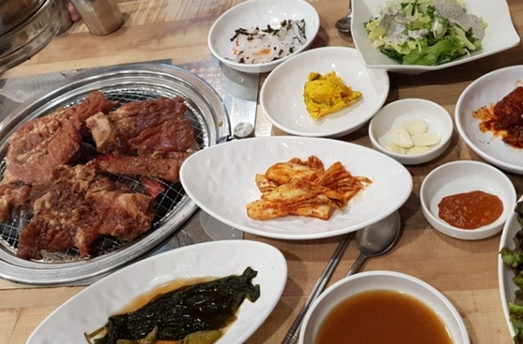 왕릉일가의 특제 소스로 맛을 낸 갈비는 숯불에 구워 더욱 풍미가 뛰어납니다. 불판은 직접 갈아야 하며, 신선한 야채는 셀프 코너를 이용하면 됩니다.