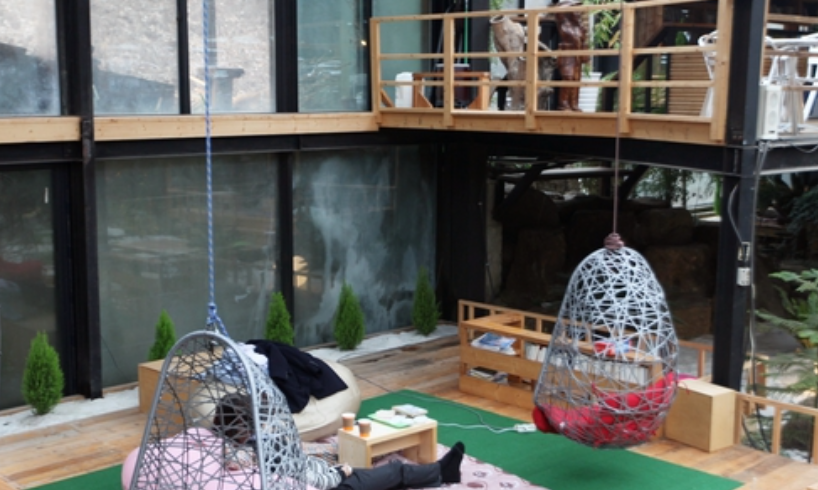 숲속 공기를 마시며 여유를 즐길 수 있는 야외 테라스도 마련되어 있습니다. 2층과 3층에는 다양한 종류의 해먹이 설치되어 있습니다.