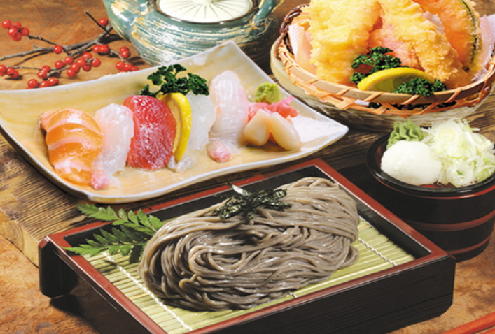 일본 소바 명인 하세베 노리히코의 레시피로 만든 자루소바정식은 쫄깃하고 담백한 소바면을 시원한 육수에 적셔 먹는 즐거움을 선사합니다.