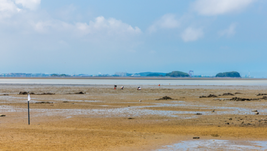 썰물 때 넓게 드러나는 갯벌에서는 바지락, 동죽 등 다양한 조개를 잡을 수 있습니다. 특히 맛조개가 많이 나기로 유명합니다.