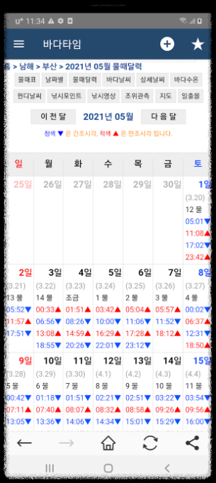 그래프 제공: 물때 정보를 그래프로 제공하여 시각적으로 쉽게 이해할 수 있습니다. 물이 들어오고 나가는 시간을 한눈에 파악할 수 있습니다.