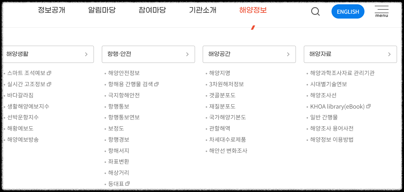 조류 예보: 특정 해역의 조류 흐름을 예보하여 조류가 강한 시간대를 미리 파악할 수 있습니다. 이는 낚시나 해양 스포츠를 즐기는 사람들에게 매우 유용한 정보입니다.