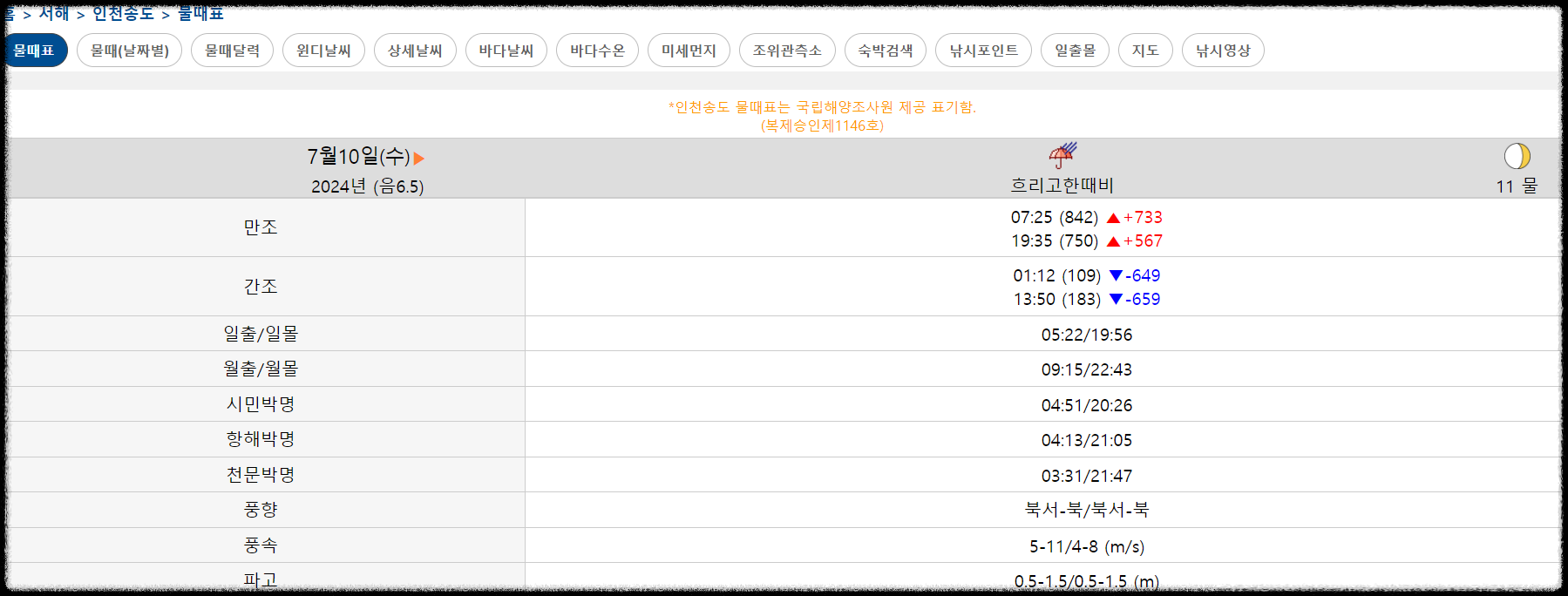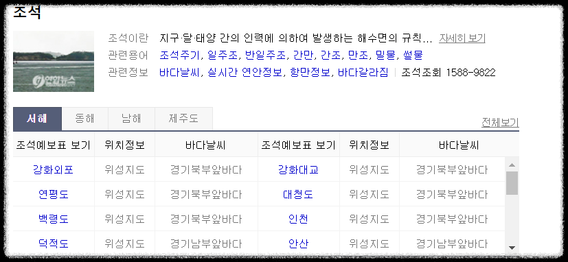 네이버, 다음 등 주요 포털 사이트에서 물때표, 조석 예보 등으로 검색하면 국립해양조사원의 정보를 기반으로 하는 물때표를 확인할 수 있습니다.