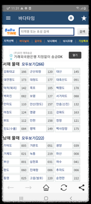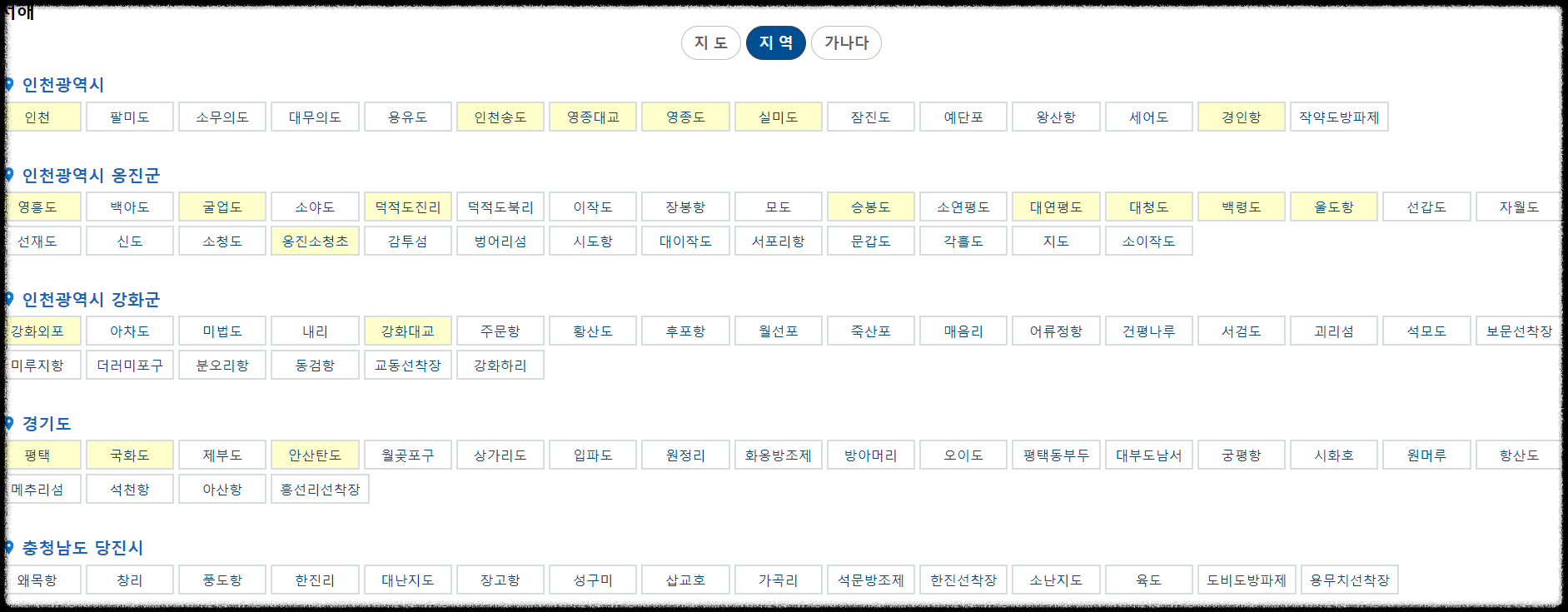 지역 선택: 초기 화면에서 국내 주요 해안 지역을 선택할 수 있습니다. 예를 들어, 인천, 서산, 군산 등 서해안 지역을 선택할 수 있습니다.