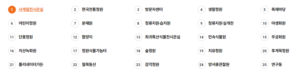 희귀특산식물전시온실, 민속식물원, 치산녹화원, 숲정원, 치유정원, 폴리네이터가든, 양서류관찰원등 다양한 시설이 자리잡고 있습니다.