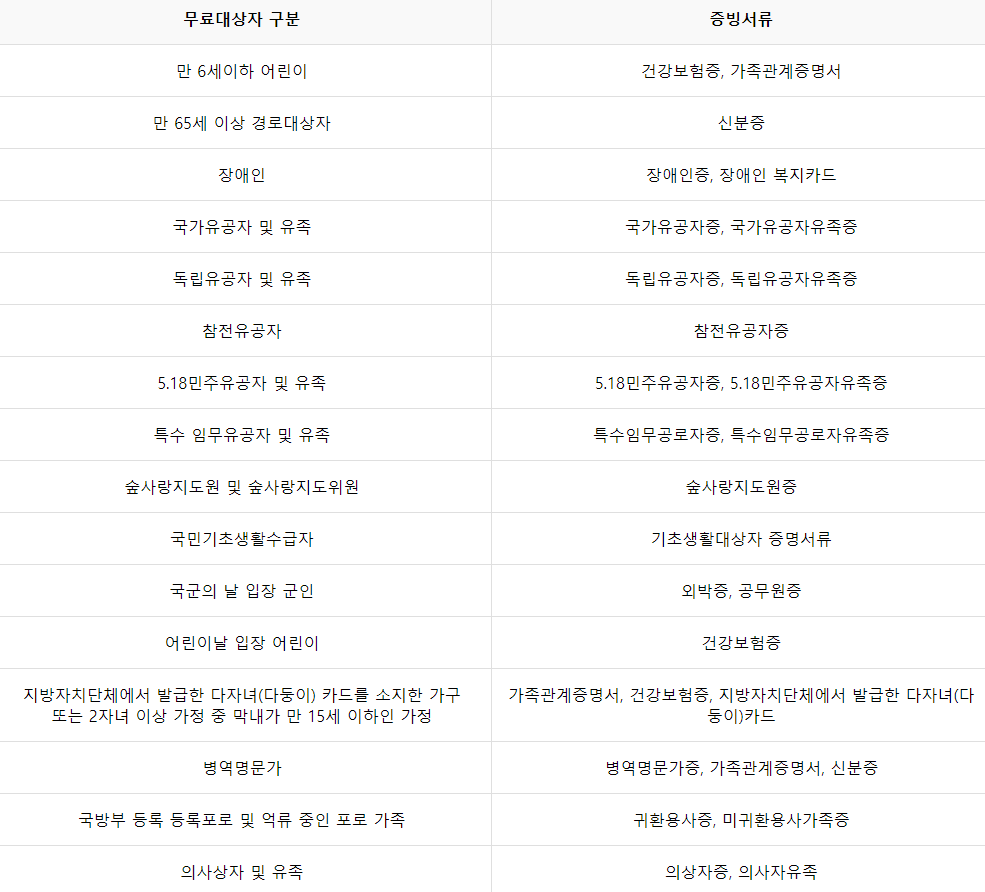 무료대상자는 65세 이상, 장애인, 국가유공자등이 있습니다. 무료대상자는 증빙서류를 지참하셔서 방문하셔야 합니다. 구체적인 정보는 아래의 사진을 참고하시기 바랍니다.