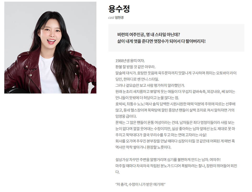 주인공 용수정 역은 배우 엄현경이 맡을 예정이며 거상 임상옥의 신념을 가지고 오늘날을 살아가는 인물입니다.