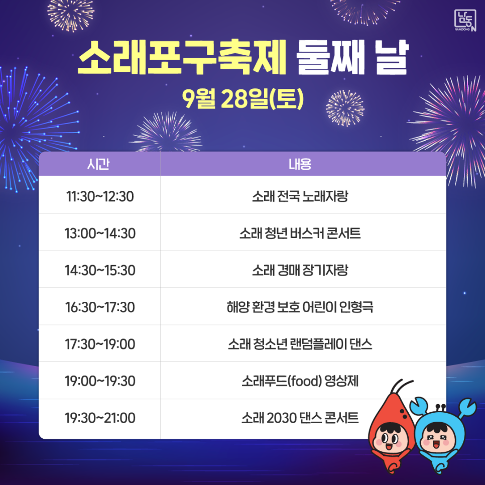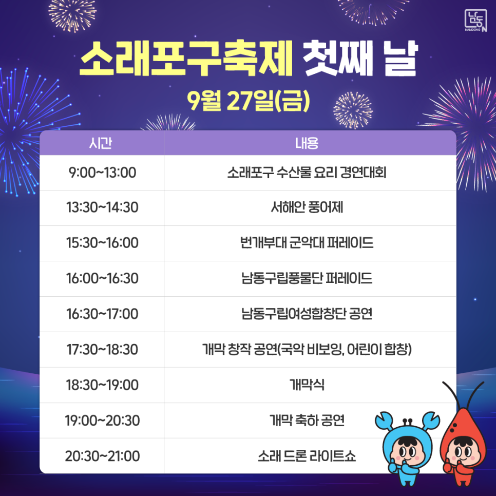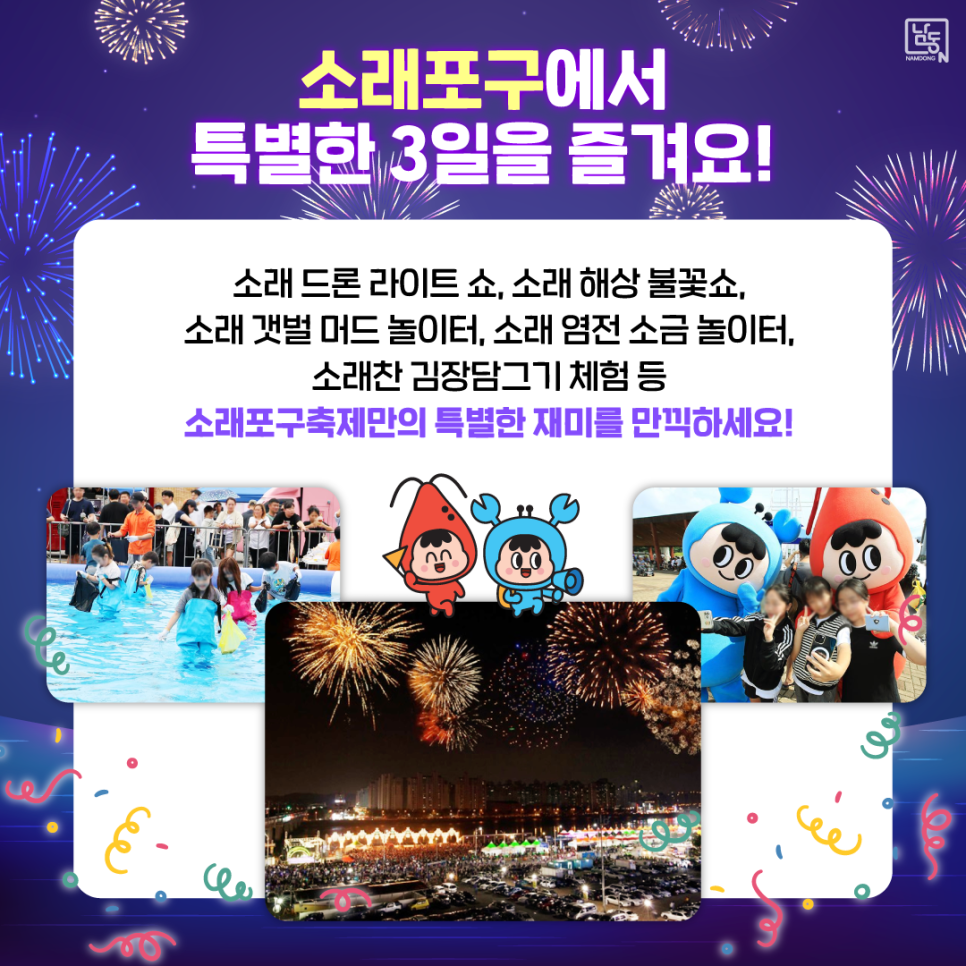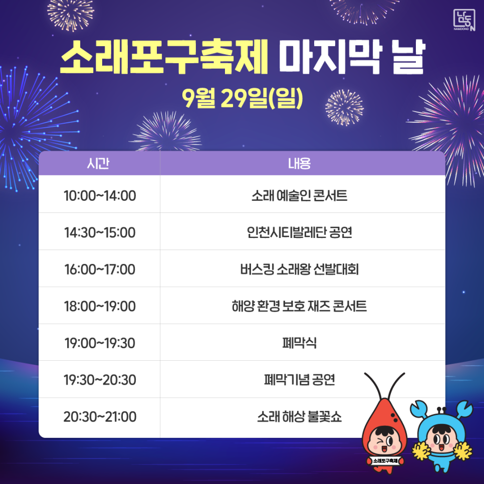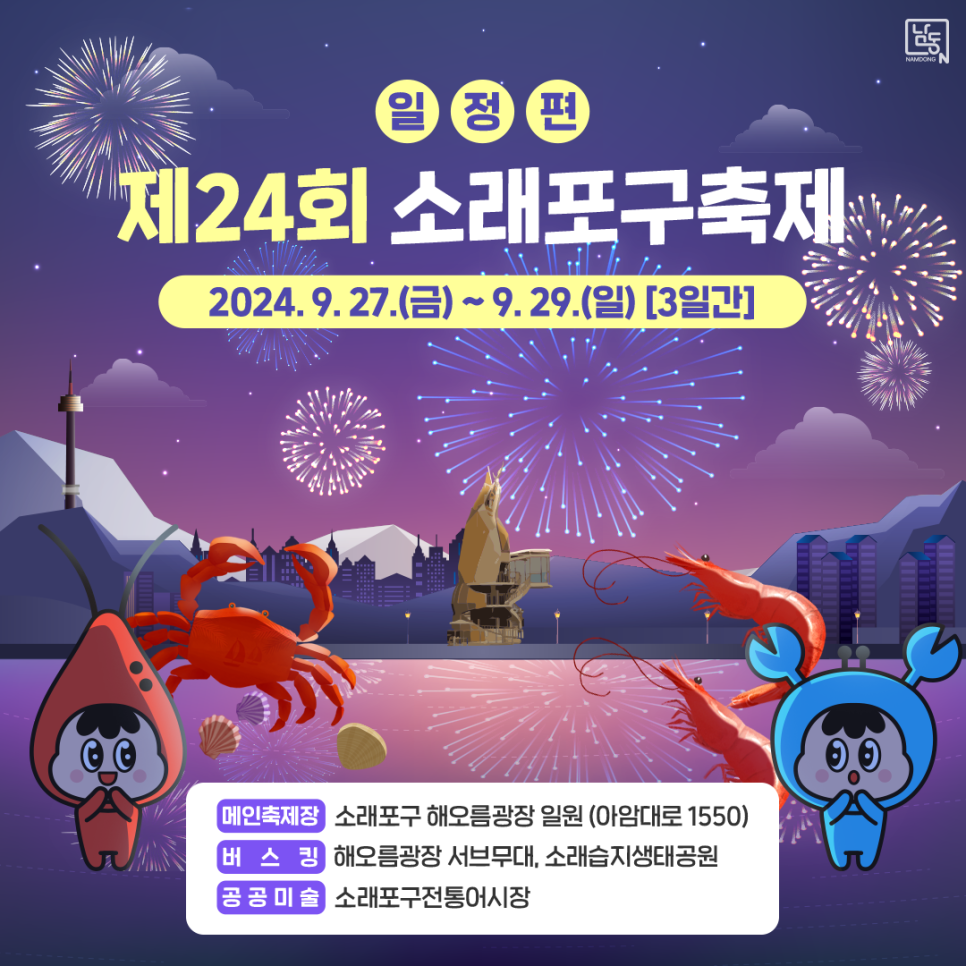 이번 축제는 소래포구의 해오름광장에서 열리며, 지역 주민들과 관광객들이 함께 어울려 소래포구의 자연과 문화를 체험할 수 있는 특별한 행사로 준비되어 있습니다. 축제는 무료로 진행되며, 남동구와 남동문화재단이 주최하는 이번 행사에 대한 문의는 032-453-2142로 가능합니다.