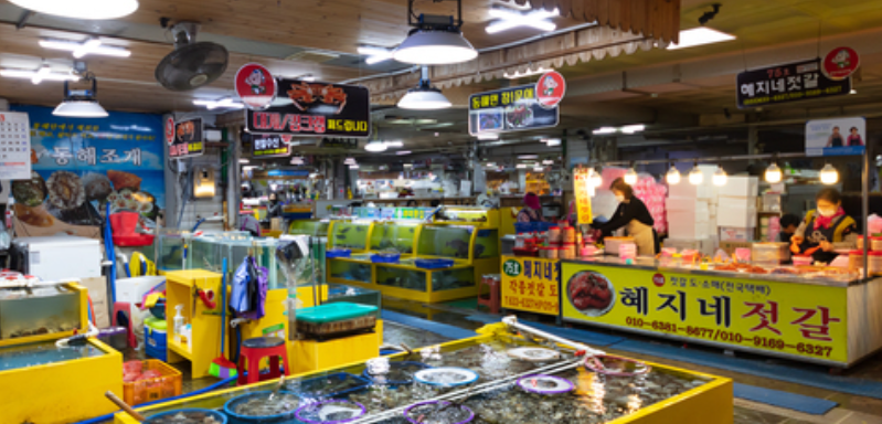 거대한 참치부터 작은 새우까지, 동해 바다에서 갓 잡아온 해산물들이 시장 곳곳을 채워 바다의 풍요로움을 한눈에 느낄 수 있는 경험을 선사합니다.