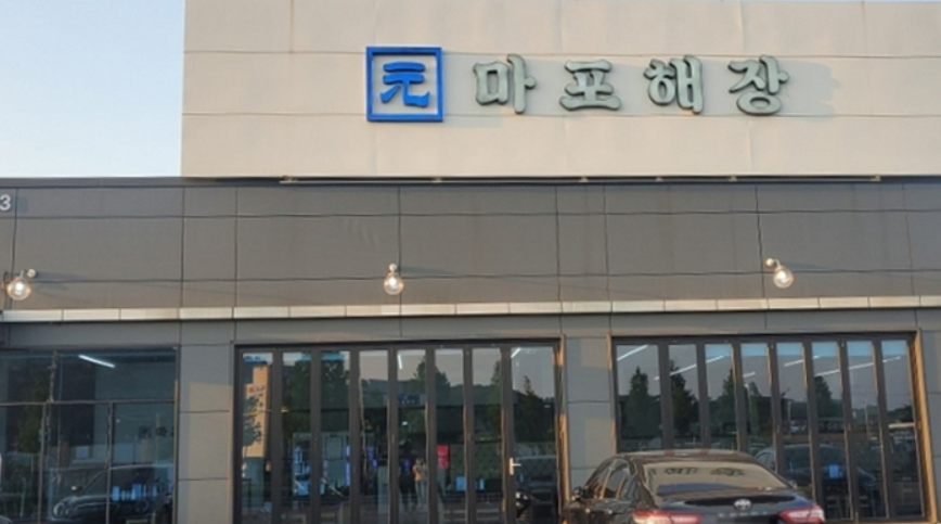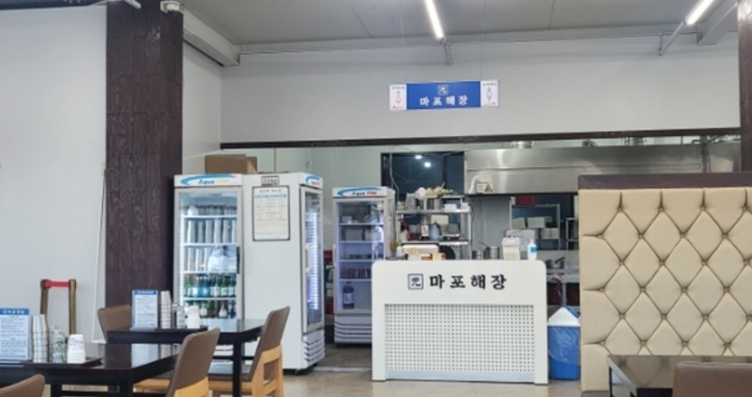 마포해장은 큰 길가에 위치한 1층짜리 회색 건물로, 커다란 간판 덕분에 쉽게 찾을 수 있습니다. 건물 앞에는 넓은 주차장이 있어 편리하게 주차할 수 있습니다.