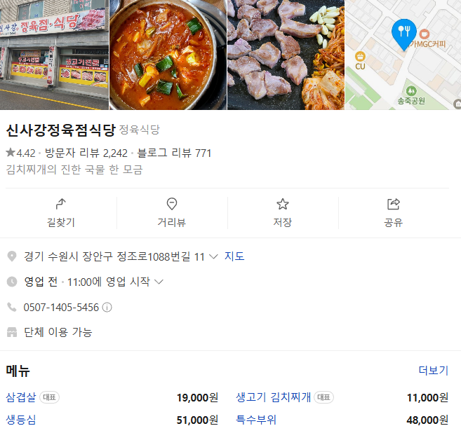 마지막으로 소개할 신사강정육점식당은 정육점과 식당이 결합된 형태의 공간으로 고기를 직접 고른 뒤 2층에서 편하게 식사할 수 있는 방식입니다. 삼겹살과 김치찌개가 특히 유명하며 점심 특선인 생고기 김치찌개는 깊은 국물 맛으로 잘 알려져 있습니다. 선짓국을 서비스로 제공하는 점도 많은 손님들이 만족하는 부분입니다. 주차 공간이 넉넉해 접근성도 뛰어납니다.