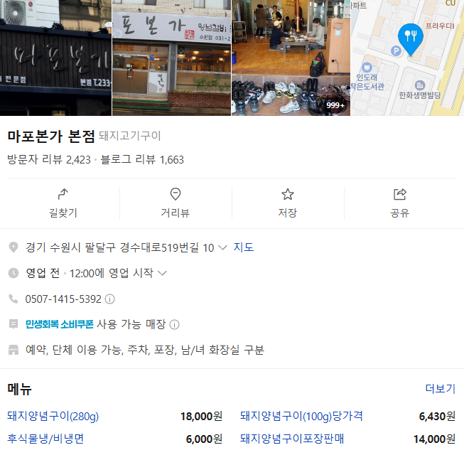 돼지왕갈비를 제대로 맛보고 싶다면 인계동의 마포본가가 제격입니다. 이곳은 좌식 테이블, 입식 테이블, 단독 룸 등 다양한 좌석 배치를 갖추고 있어 각종 모임 장소로 손색이 없습니다. 숙성 과정을 거친 돼지왕갈비는 부드럽고 육즙이 살아 있으며 생고기 상태에서도 결이 잘 잘린다는 점이 특징입니다. 곁들여 나오는 밑반찬은 깔끔하고 풍성하며, 식사 후 즐길 수 있는 된장찌개나 냉면도 합리적인 가격으로 제공됩니다.