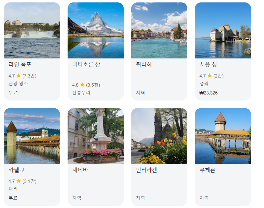 특히 융프라우, 마테호른, 루체른 등 유명 관광지는 한국인들에게도 친숙하며, 스위스 초콜릿, 치즈, 시계 등 다양한 쇼핑 품목도 인기입니다.