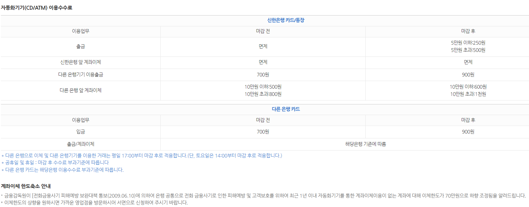 신한은행 고객센터 자동화 코너 수수료 인출한도