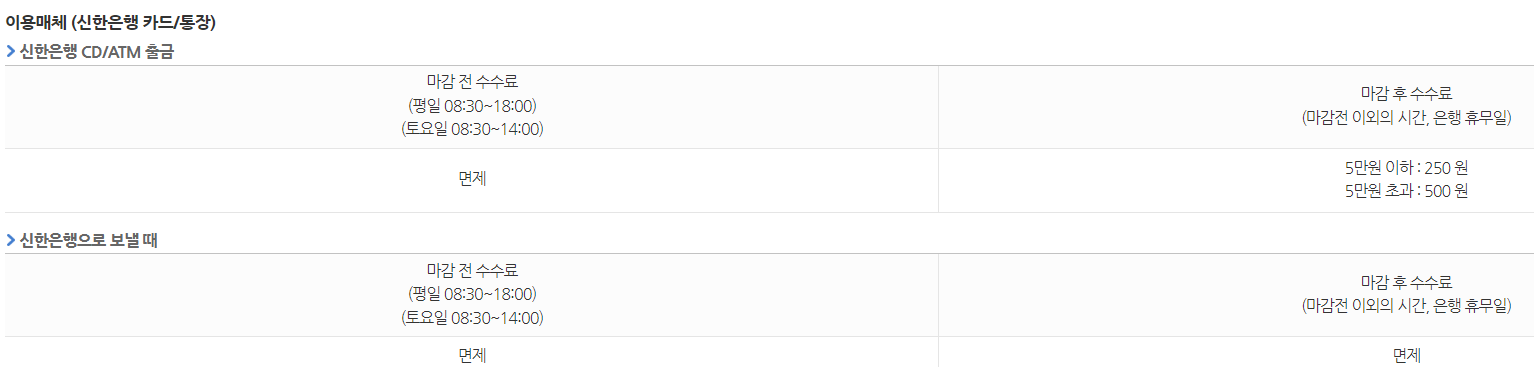 자동화 코너 수수료 및 인출시에 한도등에 대해서도 참고사항으로 안내해 드리겠습니다. 보통 영업시간안에 출금을 하면 수수료가 없습니다. 아래 이미지를 참고하시기 바랍니다.